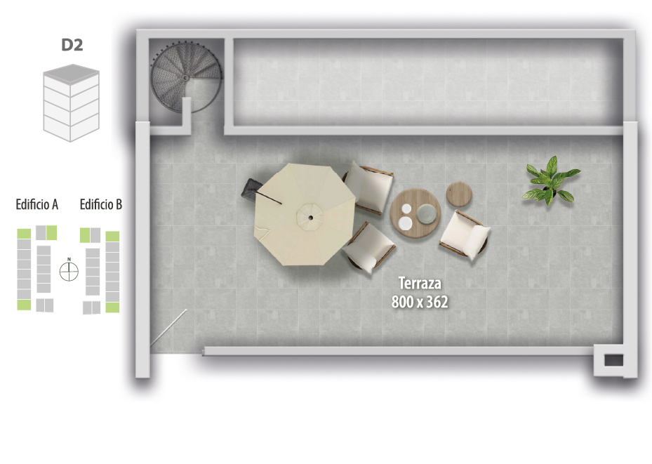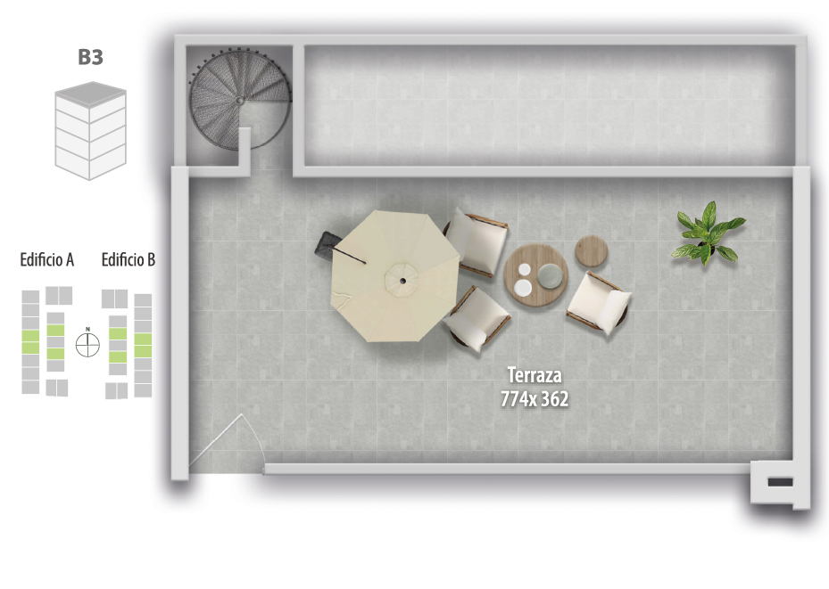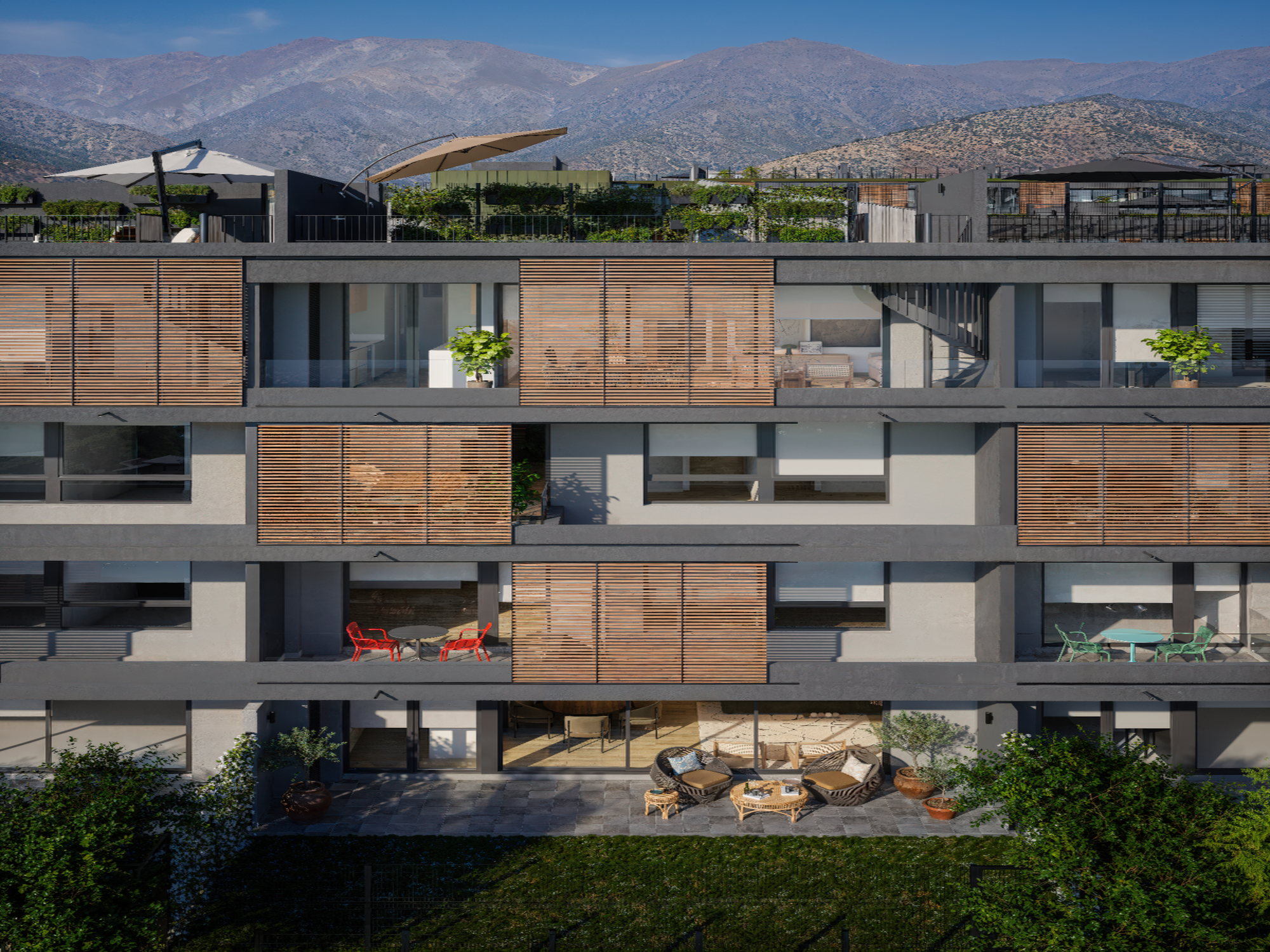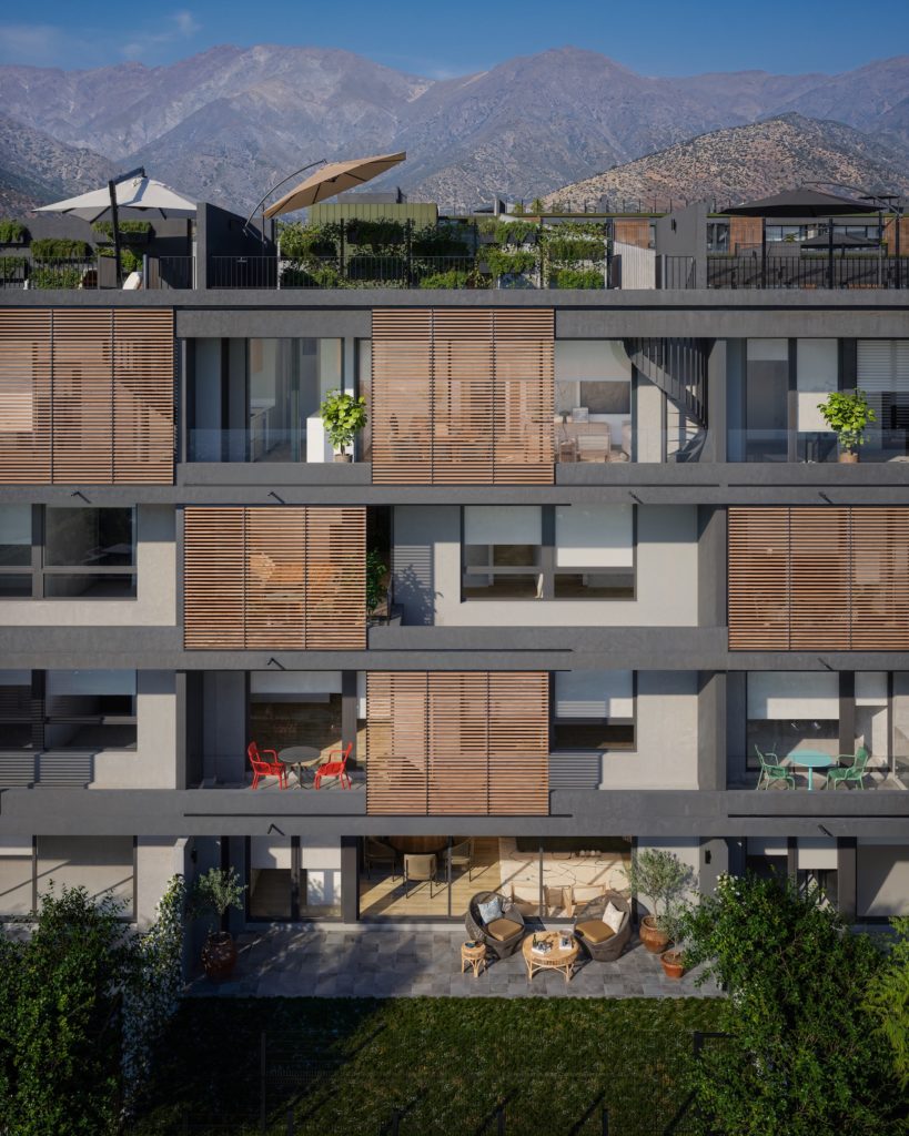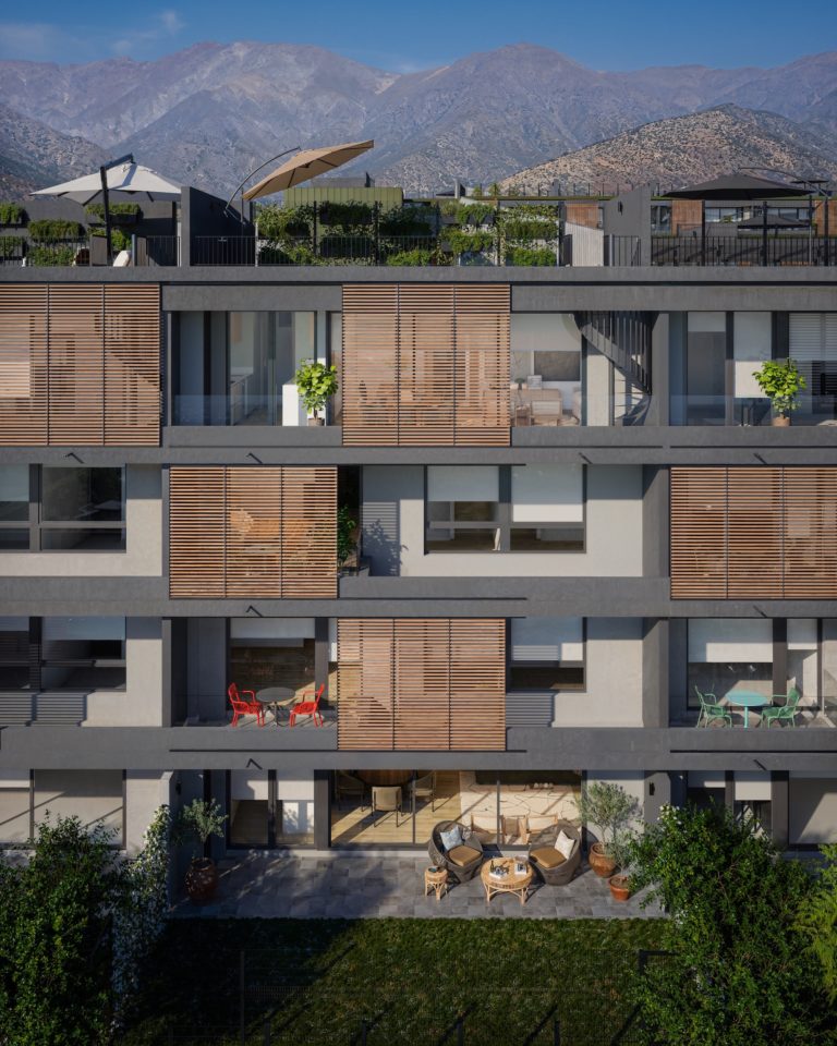 Espacios exteriores privados: Departamentos con patio en primer piso o rooftop en altura, según tipología, todos con vistas y ubicaciones únicas dentro del proyecto.