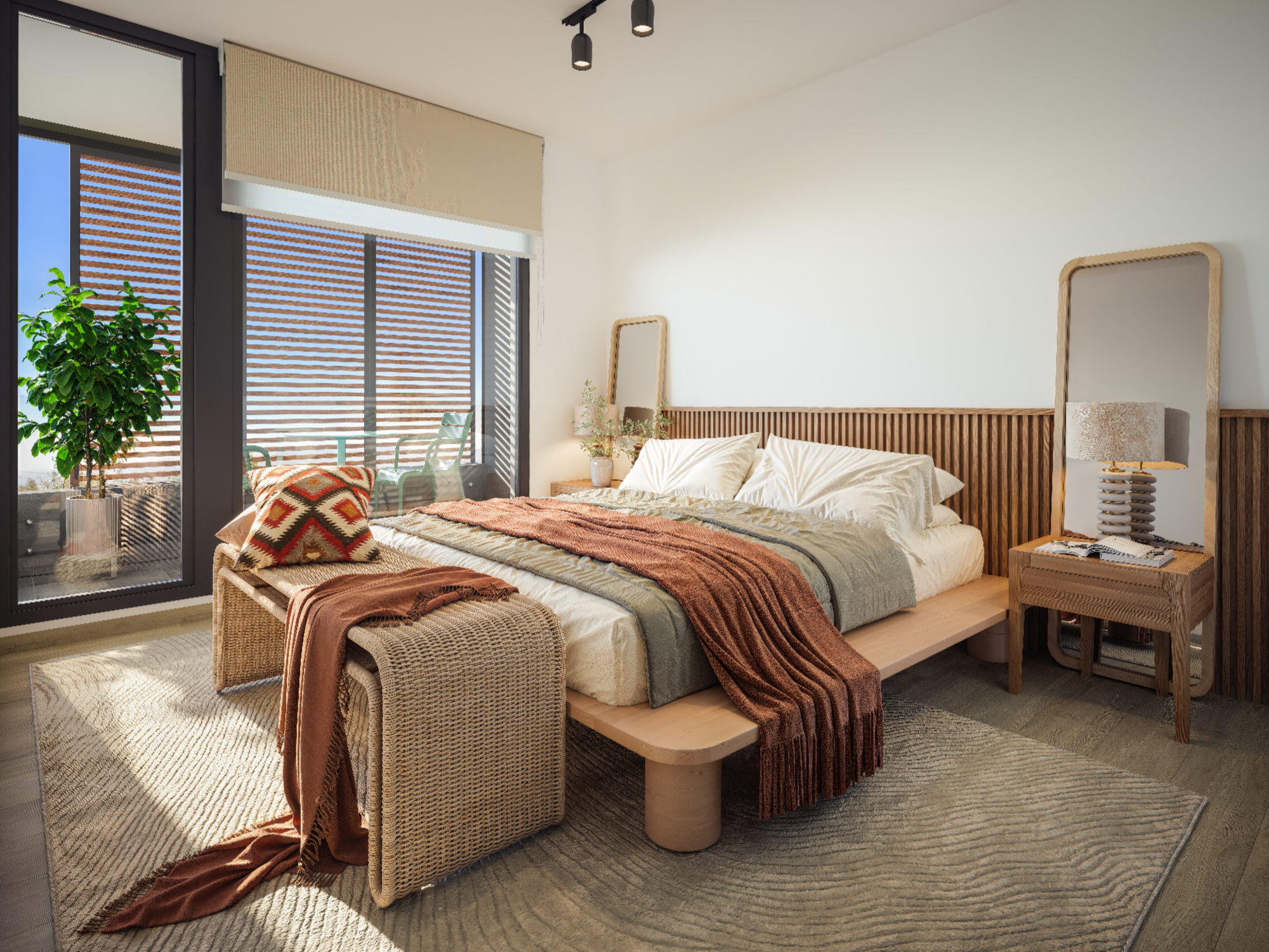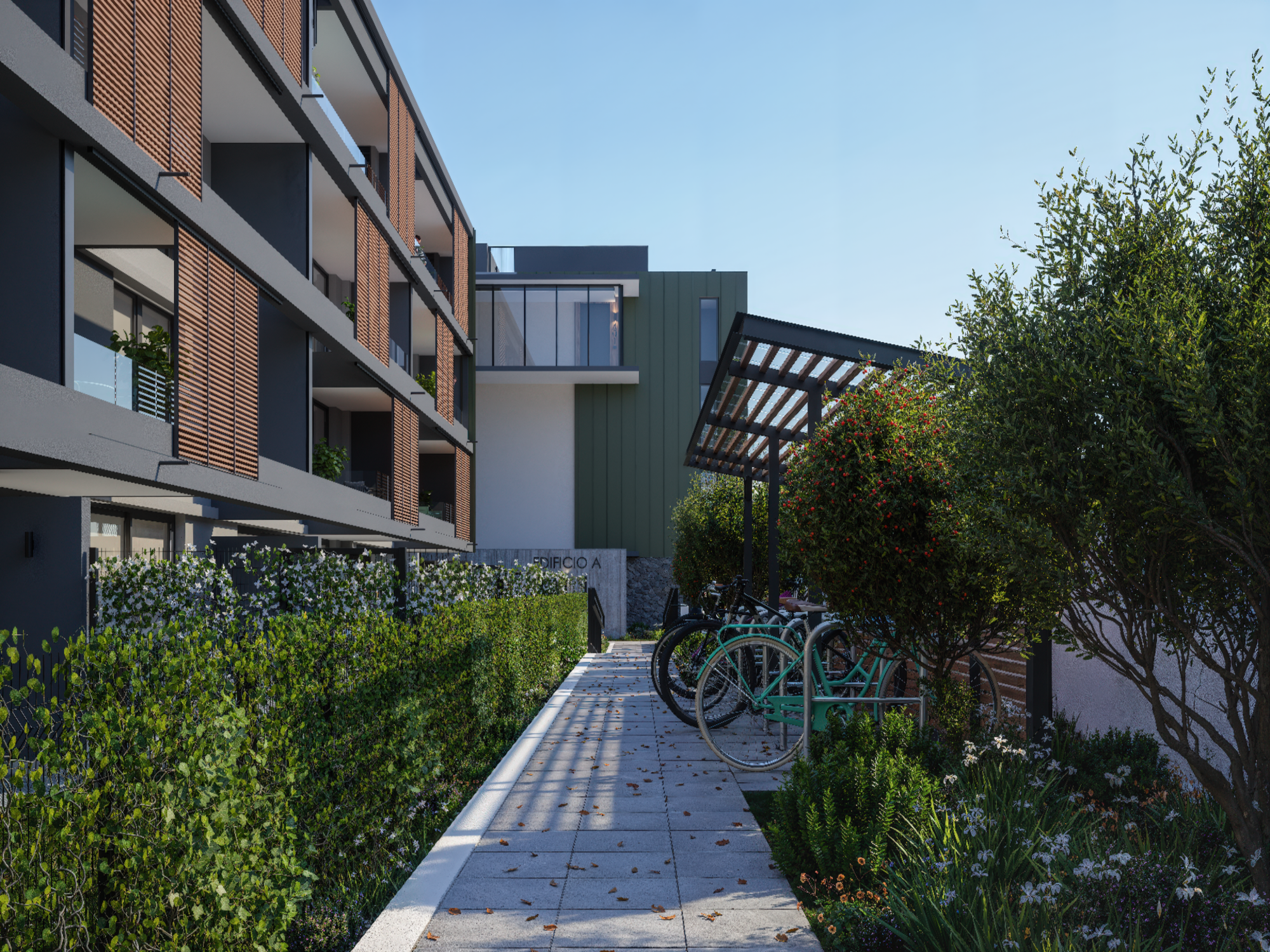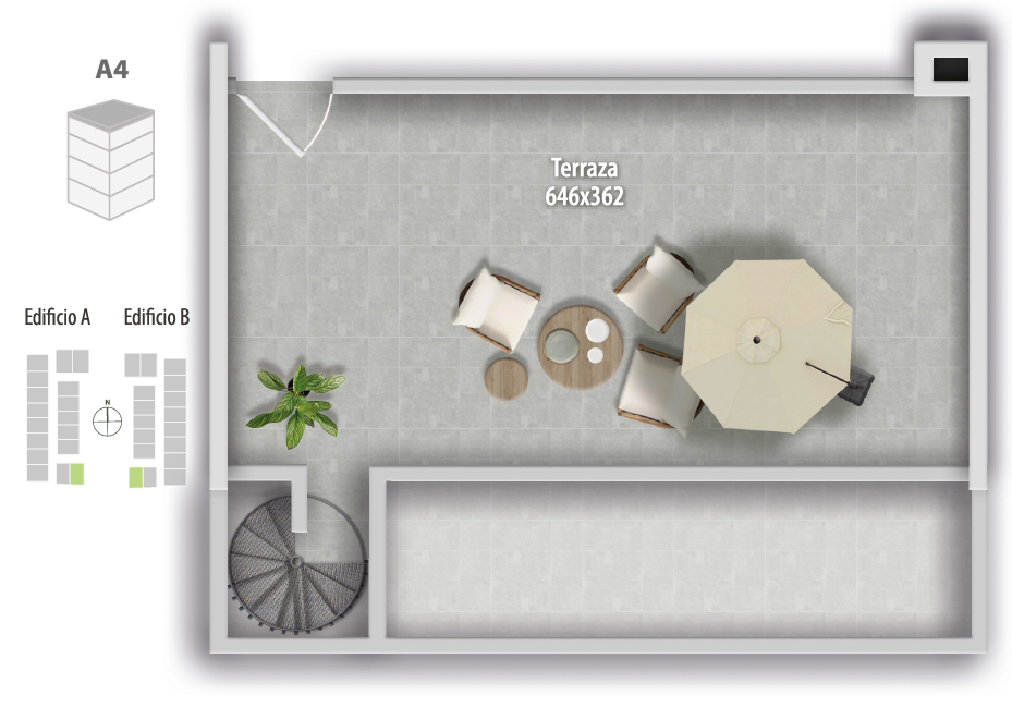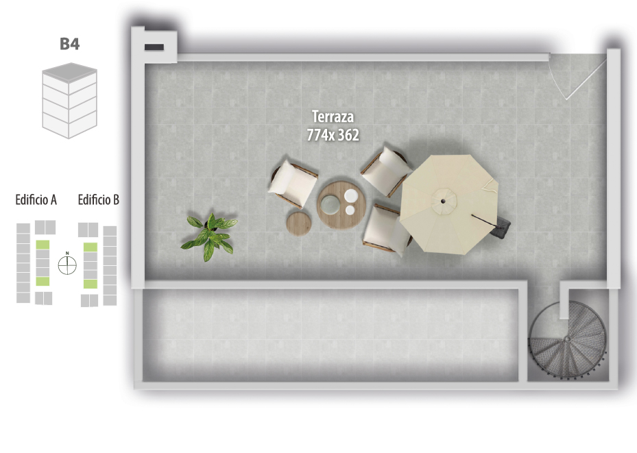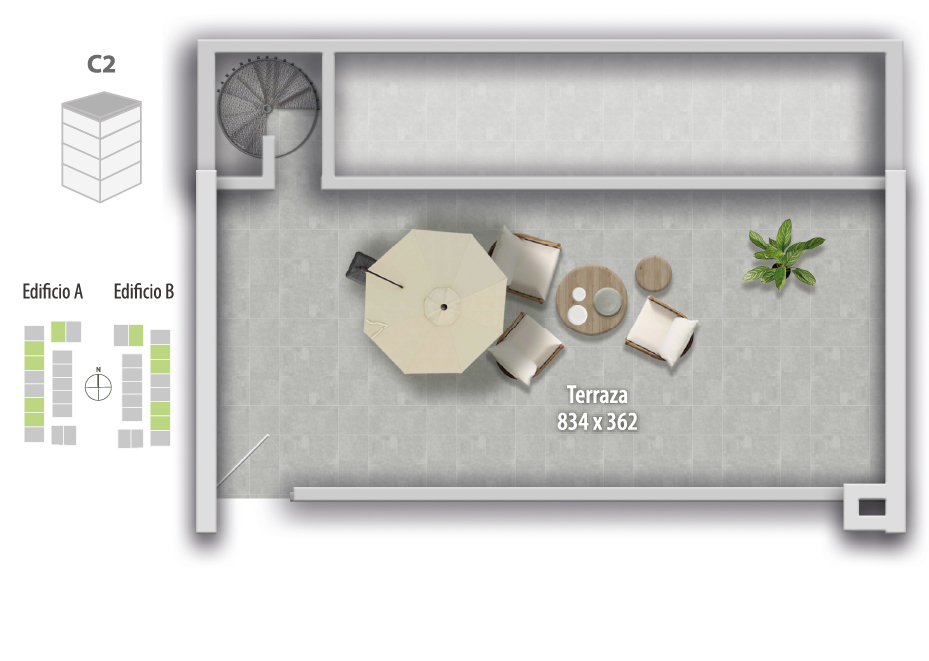 Espacios exteriores privados: Departamentos con patio en primer piso o rooftop en altura, según tipología, todos con vistas y ubicaciones únicas dentro del proyecto.