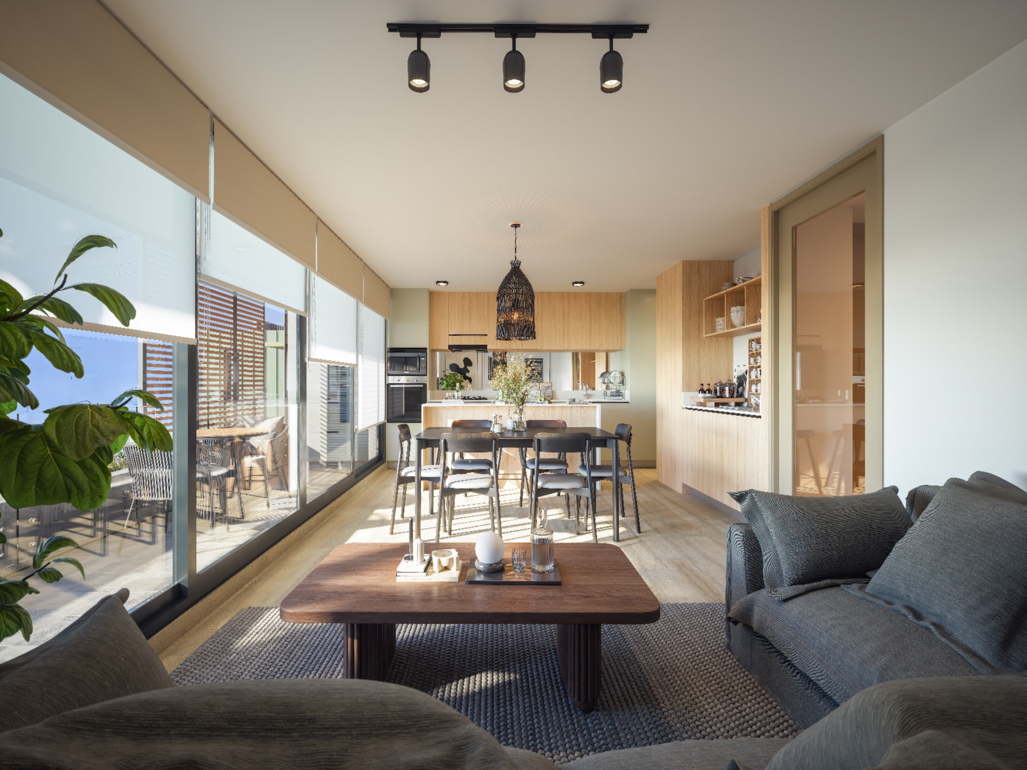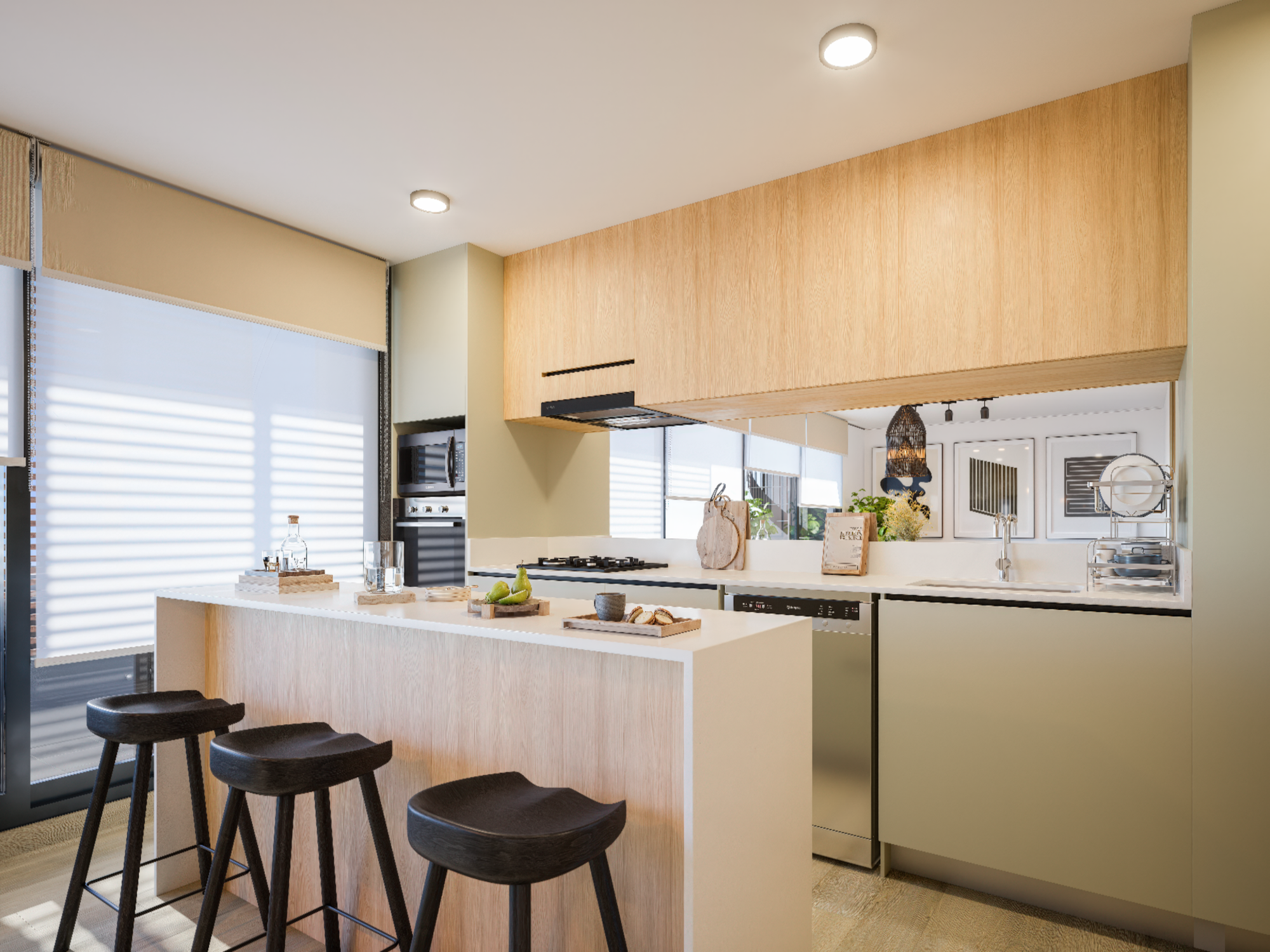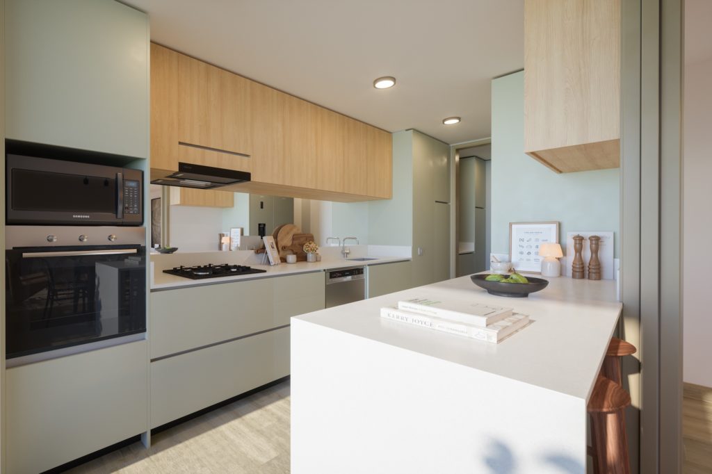 Cocina equipada y confort moderno: Las unidades cuentan con cocina equipada con campana, horno eléctrico y encimera vitrocerámica a gas, además de logia ventilada y calefacción mixta con caldera individual, entregando eficiencia y control del consumo.