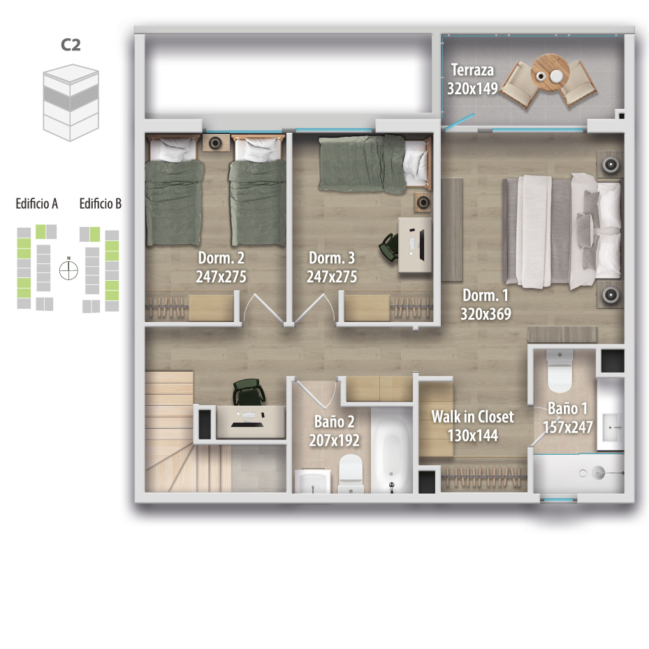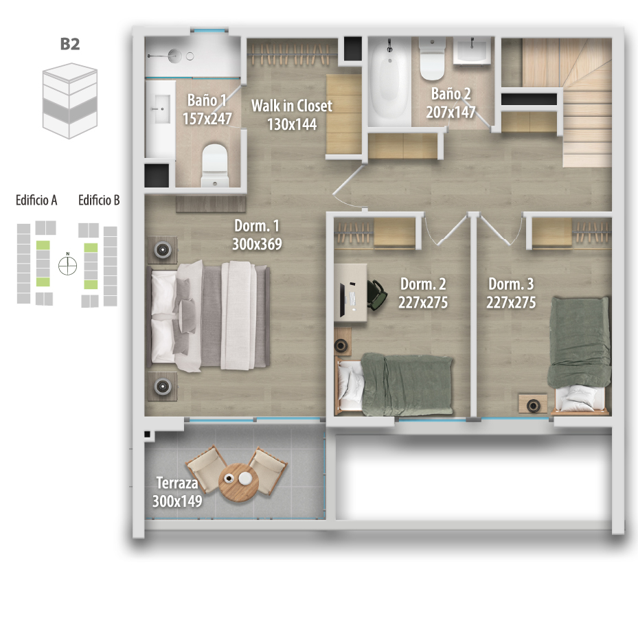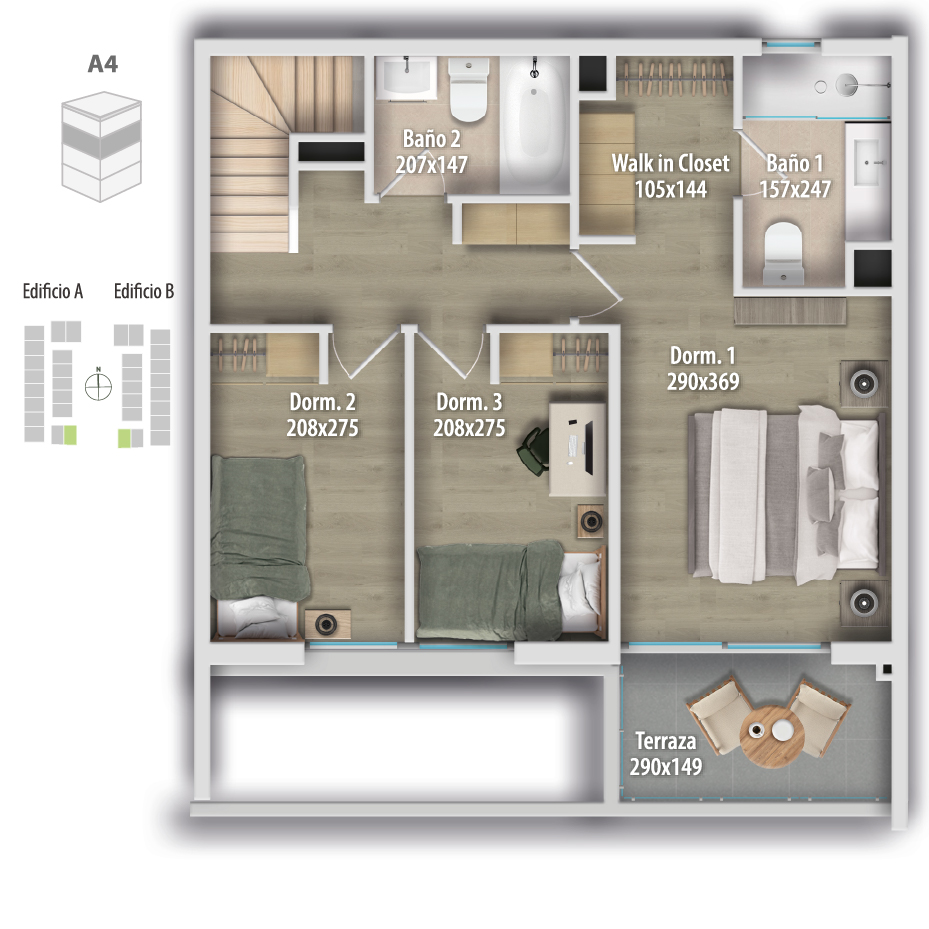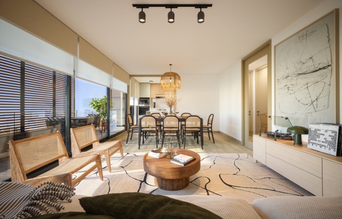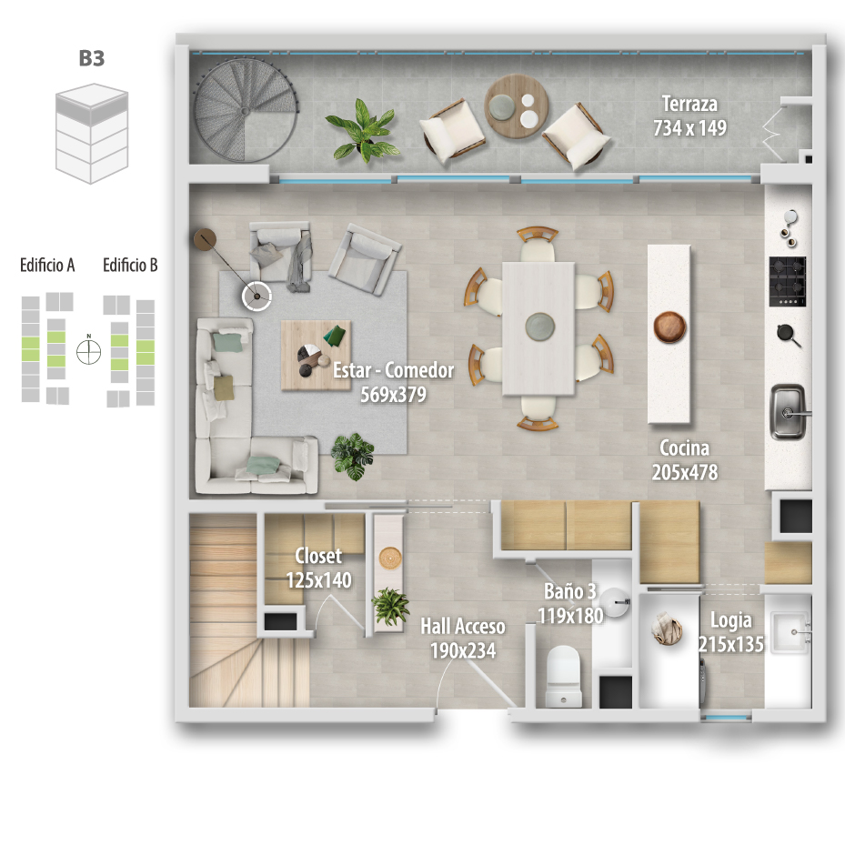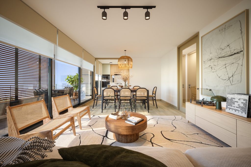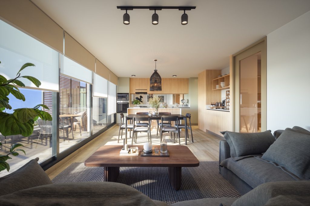 Los departamentos cuentan con superficies desde 94,67 m² hasta 116,71 m² útiles, más terrazas. Todas las unidades incluyen 3 dormitorios y 3 baños, y ofrecen dos alternativas de cocina: integrada o semi integrada, ambas con espacio para comedor diario y comedor tradicional.