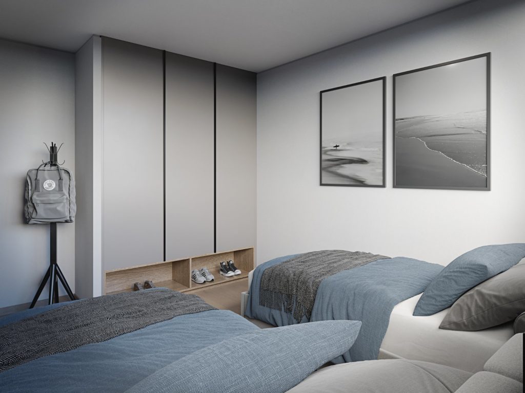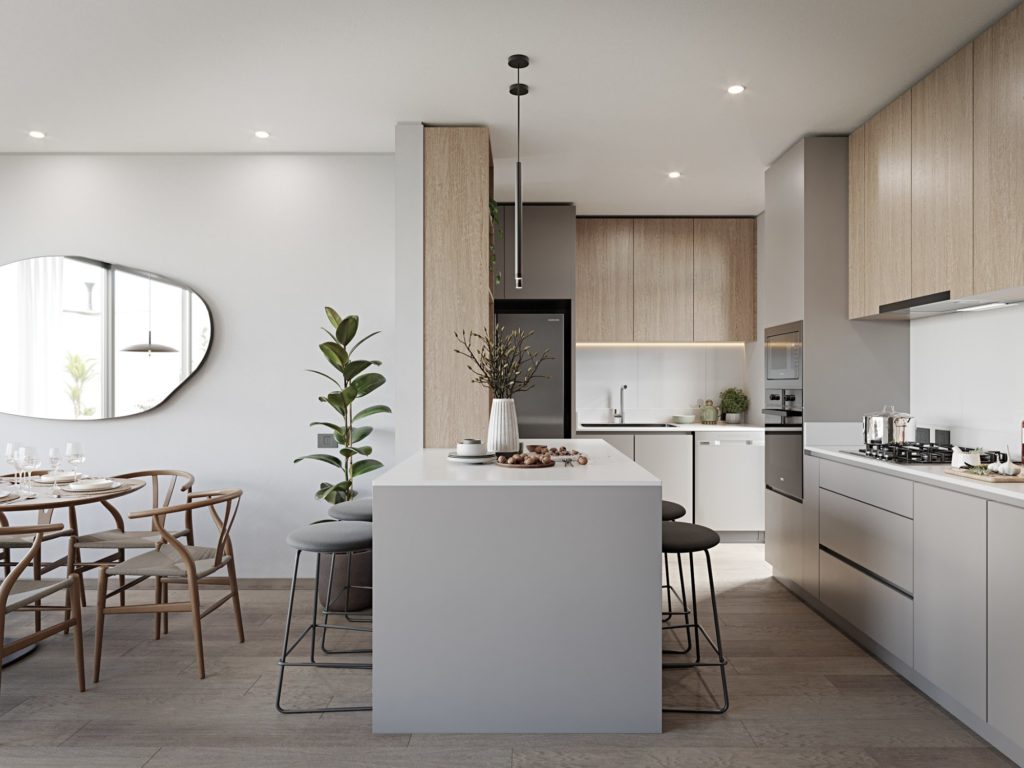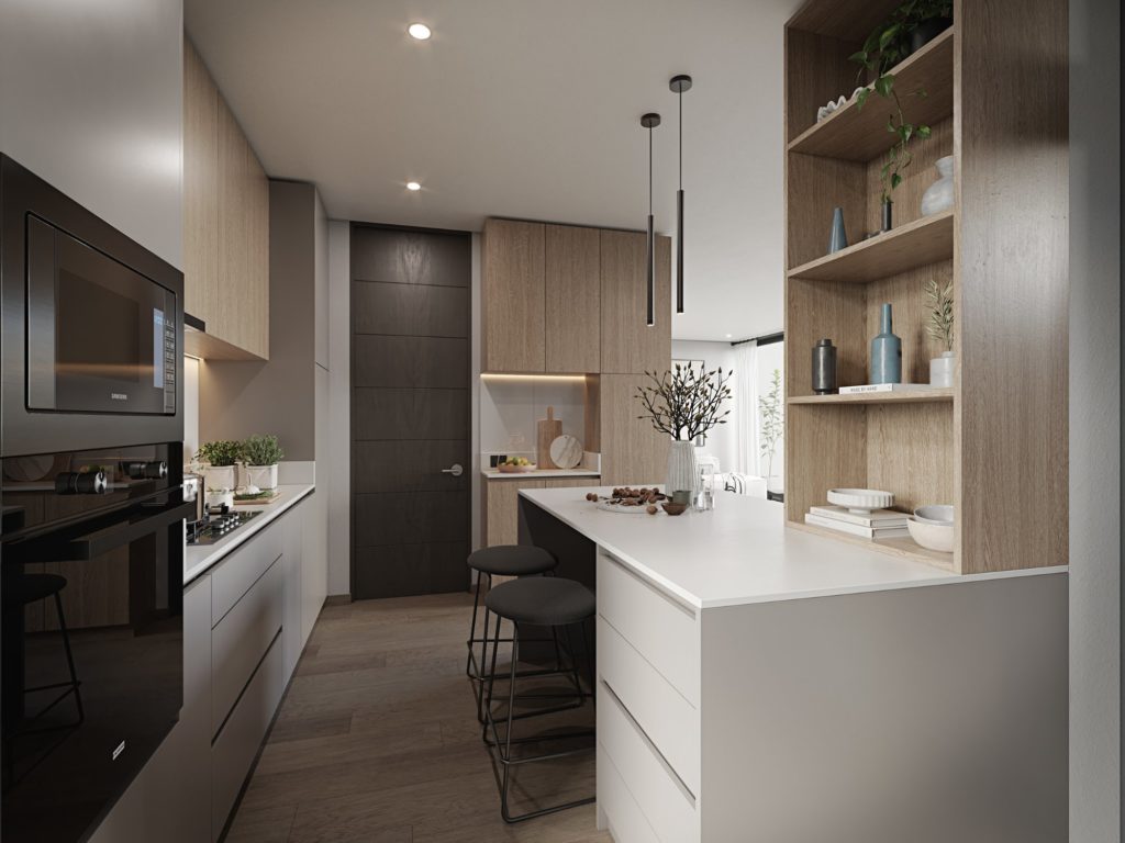 Cocina de alto estándar y diseño funcional: Cocinas equipadas con cubiertas de cuarzo de gran durabilidad y estética moderna. Incluyen horno y microondas empotrados, encimera a gas y campana extraíble, logrando un espacio de trabajo eficiente y sofisticado para disfrutar la experiencia culinaria.